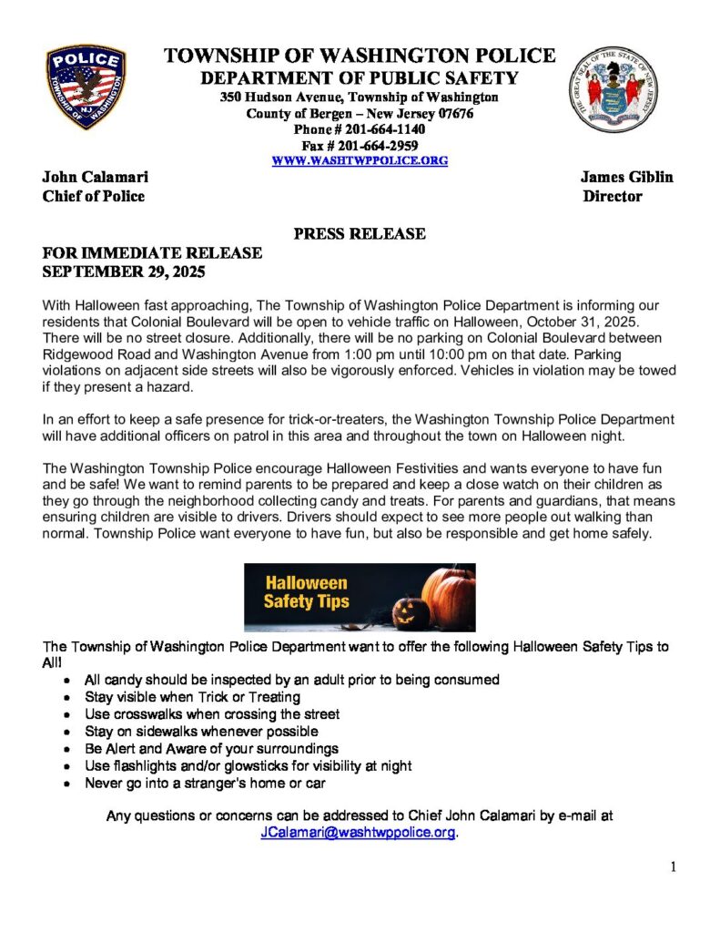Official Press Release – September 29, 2025 – Halloween on Colonial Blvd https://www.washtwppolice.org/wp-content/uploads/2025/09/Halloween-Press-Release-2025.pdf By chris|2025-09-30T08:06:13-05:00September 29th, 2025|Uncategorized|Comments Off on Official Press Release – September 29, 2025 – Halloween on Colonial Blvd Share This Story, Choose Your Platform! FacebookTwitterRedditLinkedInTumblrPinterestVkEmail About the Author: chris Related Posts The Washington Township Police Department would like to extend our sincere thanks to Erick Tavares The Washington Township Police Department would like to extend our sincere thanks to Erick Tavares Today, we honor the United States Marine Corps Today, we honor the United States Marine Corps Solicitor Information Solicitor Information Mischief Night and Halloween Night – 9:00 PM Curfew Mischief Night and Halloween Night – 9:00 PM Curfew Linwood Avenue Road Closure – Monday October 6, 2025, and Tuesday October 7, 2025 Linwood Avenue Road Closure – Monday October 6, 2025, and Tuesday October 7, 2025